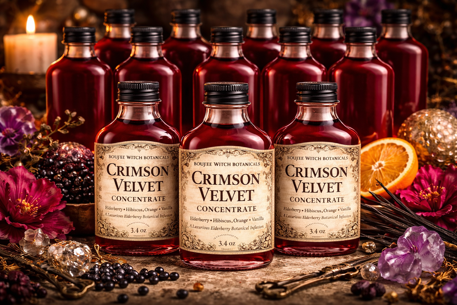 Crimson Velvet Concentrate is a richly layered elderberry botanical infusion crafted in the tradition of the old-world apothecary. Deep, jewel-toned elderberries are slowly simmered with vibrant hibiscus, bright orange, and soft vanilla to create a concentrated base that is both potent and beautifully balanced.