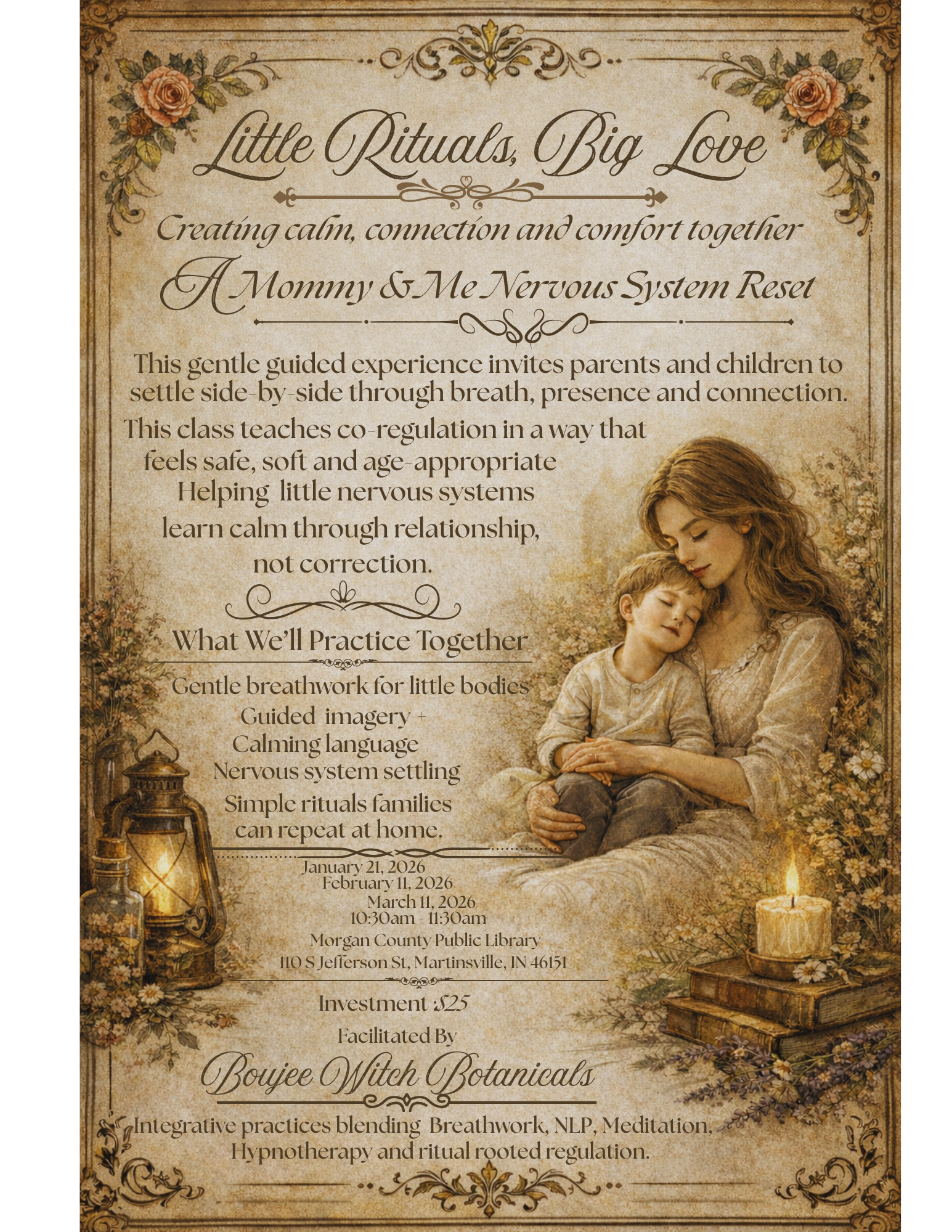 Little Rituals, Big Love is a gentle, recurring Mommy & Me workshop designed to help parents and children slow down, settle their nervous systems, and reconnect through shared presence.
